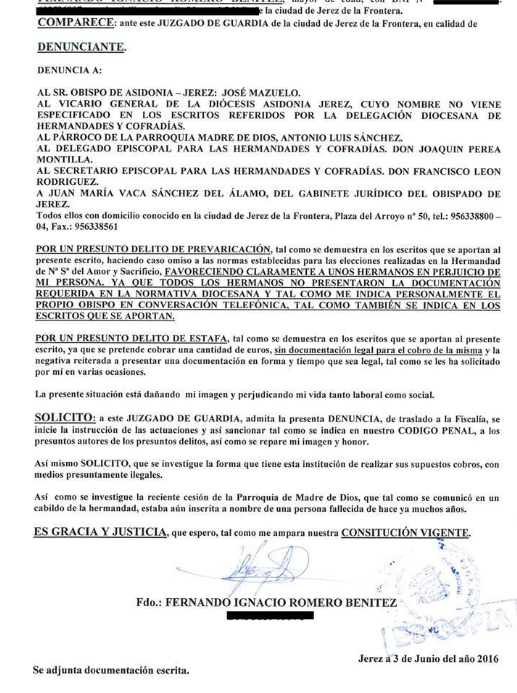 El ex hermano mayor de la hermandad de Amor y Sacrificio, Fernando Romero Benítez, ha denunciado al obispo de la diócesis de Asidonia-Jerez, José Mazuelos, así como al Vicario General de la Diócesis de Asidonia-Jerez, al párroco de la parroquia de Madre de Dios, al delegado diocesano de Hermandades y Cofradías y a un miembro del gabinete jurídico del Obispado de Asidonia-Jerez por un presunto delito de prevaricación y estafa. El propio Romero Benítez ha sido el que ha puesto en conocimiento estos hechos a través de su perfil de Facebook, donde ha colgado la copia de la denuncia que interpuso el pasado 7 de junio en el juzgado de Instrucción número 2 de Jerez.