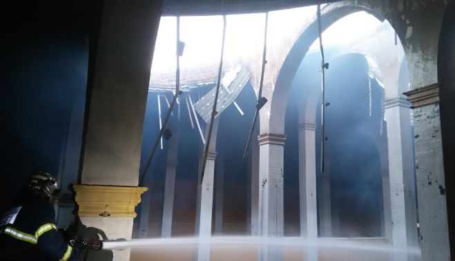 El fuego se localizó en una entreplanta, antes del primer piso, un espacio con varias habitaciones como oficinas, propagándose hacia la parte superior y afectando a la vigas de madera de la cubierta. Como consecuencia, se derrumbó parte de ésta, aproximadamente unos 100 metros cuadrados de cubierta. Tras esa circunstancia el objetivo de los bomberos se centró en sofocar y controlar el incendio para que no afectara a una nave colindante, algo que se consiguió refrescando bien la zona y dejando un retén que ha procedido a ir enfriando las cabezas de las vigas.