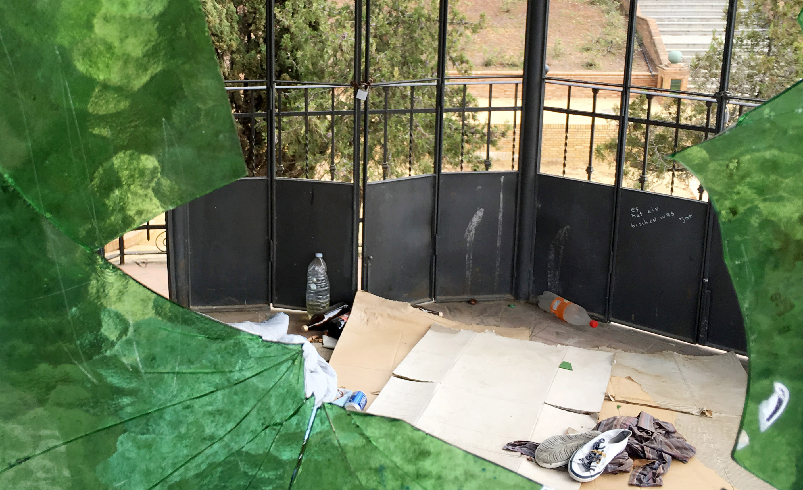Unos cartones sobre el suelo, zapatos viejos, restos de basura, cristales rotos… Evidencias de que este templete, que constituye uno de los ejemplos más innovadores y poco peculiares de la arquitectura en hierro en la ciudad, ha sido de todo menos conservado en óptimas condiciones. Tras múltiples emplazamientos, el Ayuntamiento lo rescató de la casa de ejercicios espirituales del padre Damián, situada en la carretera de la Cartuja, pero visto como lo ha conservado y el dinero público despilfarrado, mejor hubiera sido mantenerlo allí, alejado del vandalismo y la degradación.