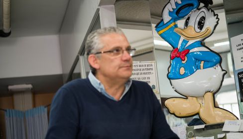 Entre patucos, peleles y un Pato Donald de un metro de largo trabaja Bernardo Gómez Íñigo de lunes a sábado. Él es el heredero del mítico establecimiento que acogió el nombre del ave más famosa de la industria Disney. "Está autorizado por Trump, porque lleva el nombre de él, no del pato", bromea su padre José Antonio Gómez, quien acaba de entrar para hacer una de sus visitas rutinarias a su hijo. Sin embargo, no fue él tampoco quien fundó la tienda Donald en 1969, sino su madre Carmen Íñigo, hija de Sebastián Íñigo —el propietario del emblemático comercio Tejidos Minerva, que data de años antes de la Guerra Civil Española—.