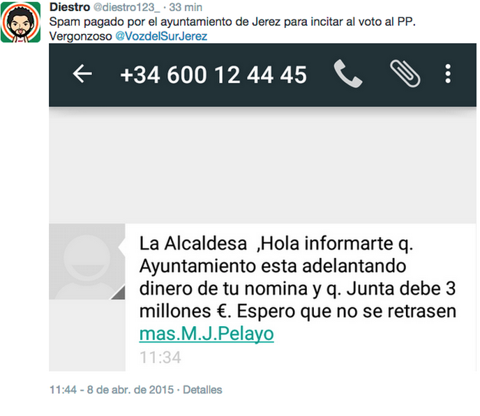 "La alcaldesa. Informarte q. Ayuntamiento esta adelantando dinero de tu nomina y q. Junta debe 3 millones €. Espero que no se retrasen mas. M.J. Pelayo", reza literalmente el SMS masivo remitido supuestamente por la propia candidata del PP en Jerez, que por ahora no ha desvinculado al Ayuntamiento de un spam que ha corrido como la pólvora por móviles y grupos de Whatsapp y que incluso podría vulnerar la Ley de Protección de Datos. En estos momentos, además, la Ley Orgánica de Régimen Electoral no permite bajo ningún concepto hacer este tipo de comunicaciones con marcado carácter propagandístico, ya que en el plazo que media desde la convocatoria de las elecciones y el inicio de la campaña electora está estrictamente prohibida la propaganda y los actos que de alguna manera u otra intenten condicionar el voto.