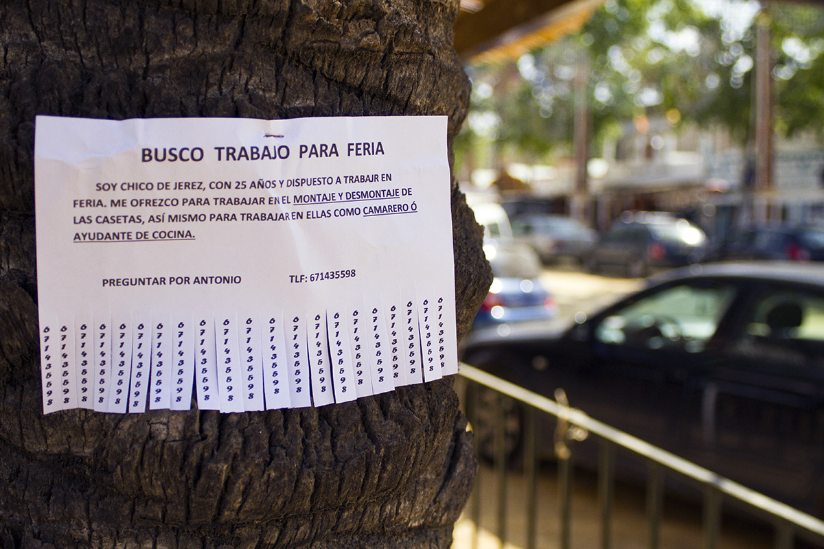 Fuera, y aunque con el sol apretando apenas se nota, las microbombillas lucen encendidas debido a que los técnicos de Iluminaciones Ximénez hacen pruebas para que el alumbrado no de una sorpresa inesperada la noche del sábado. Unos metros más abajo el ajetreo sigue siendo constante, aunque a diferencia de otros años no se percibe movimiento de jóvenes entregando currículums para trabajar de camarero, cocinero o de vigilante de seguridad en Feria. Ni siquiera se ven muchos anuncios. El que más insistencia ha puesto es Antonio, de 25 años, que se ofrece para el montaje o desmontaje de casetas y también como camarero. Ha empapelado media Feria ofreciendo sus servicios, pero desgraciadamente para él nadie se ha interesado en arrancar su número de teléfono de ninguno de los anuncios que vemos. Dos que no paran de repartir flyers son Miguel Ángel, alias Mijenz y su compañero SRT, dos grafiteros que se ofrecen para decorar casetas. La empresa para la que trabajan, Whole Grafix, está reproduciendo la fachada de la Real Escuela en la caseta que los trabajadores de esta entidad estrenan este año en el Real. “Se está animando poca gente, pero bueno, aquí seguimos repartiendo a ver si nos sale algo de última hora”.