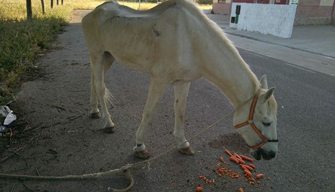 Una joven pareja jerezana ha salvado la vida de una yegua que estaba abandonada en el polígono industrial de El Portal. Vieron al animal atado por primera vez el pasado sábado 13 de mayo, día de inicio de la Feria del Caballo. Desde entonces han acudido a diario en su auxilio para proporcionarle comida y agua, además de asistencia veterinaria. Gracias al chip que portaba la yegua, ambos pudieron ponerse en contacto con la dueña del equino y contarle el mal estado del animal. La propietaria, natural de Málaga, les confesó que no tenía constancia de dicho abandono ya que hace unos seis meses que la vendió a un hombre de Chipiona que la quería para regalársela a su hija. "Pero me comentó que no llegaron a hacer el cambio de papeles", informa Cristian Oliva, quien se ha hecho cargo del rescato junto a su novia Abigail Raposo.