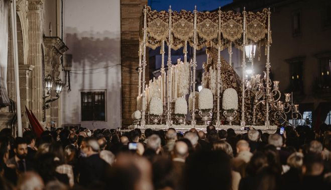 Clausura del acto de veneración a la Virgen de la O en la Iglesia de Capuchinos, y traslado de la imagen al paso de salida. Realiza el traslado la Academia de San Dionisio.