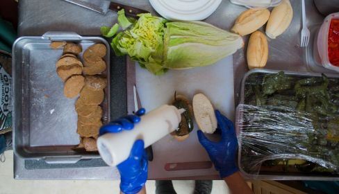 Amigos del caballo, en el número 91 de la calle Manuel Soto Sordera, se ha erigido en este año 2018 en el contrapunto a todo lo visto hasta ahora. Porque, ¿cómo se prepara una tortilla sin huevos? ¿Y un serranito sin carne de cerdo o pollo? Irene Castillo es la jefa de cocina de la caseta, que explota la discoteca Pandora. Su única experiencia trabajando en una feria la encontramos en Málaga, de donde es oriunda, aunque, como reconoce, “no tiene nada que ver con la de Jerez. Aquí hay mucho curro y doblamos turnos, desde las 10 de la mañana hasta la 1 de la madrugada”.