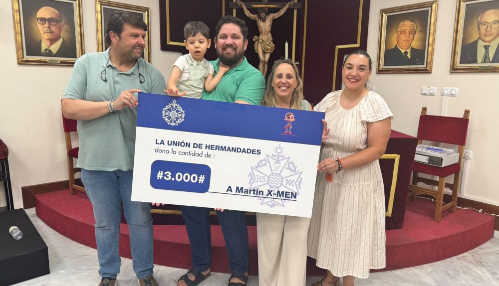 La Unión de Hermandades de Jerez ha entregado un total de 3.000 euros a la asociación La Aventura de un X-Men, procedentes de la recaudación por la venta de entradas del pregón de la Semana Santa 2025. La cantidad irá destinada íntegramente a apoyar la investigación del Síndrome de Pettigrew, una enfermedad rara que padece el pequeño Martín, de apenas dos años.