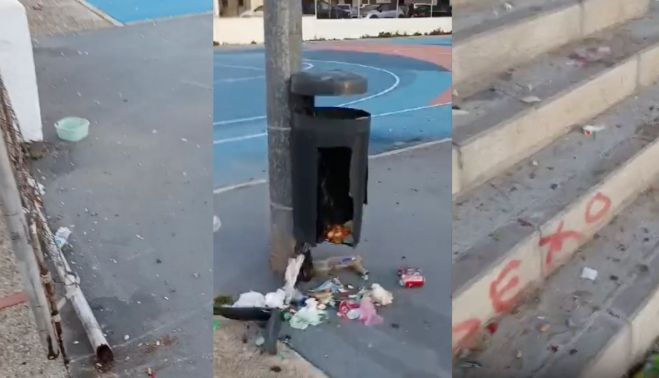 Con papeleras quemadas, vallas rotas, excrementos de perros y basura por todos lados, vecinos de la barriada Icovesa, en Jerez, han denunciado el estado de dejadez en el que se encuentran las pistas polideportivas anexas al pabellón Ruiz Mateos.