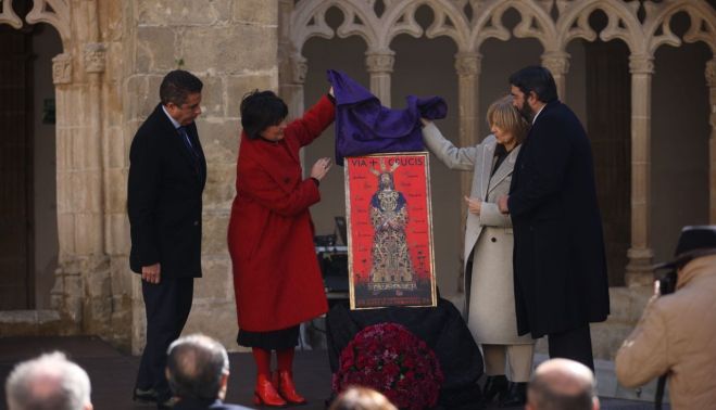 García-Pelayo, el presidente de la Unión de Hermandades y el hermano mayor de la Yedra descubrieron el cartel realizado por la artista sevillana Nuria Barrera. La obra centra toda la composición en la imagen del Señor sobre un fondo rojo intenso.