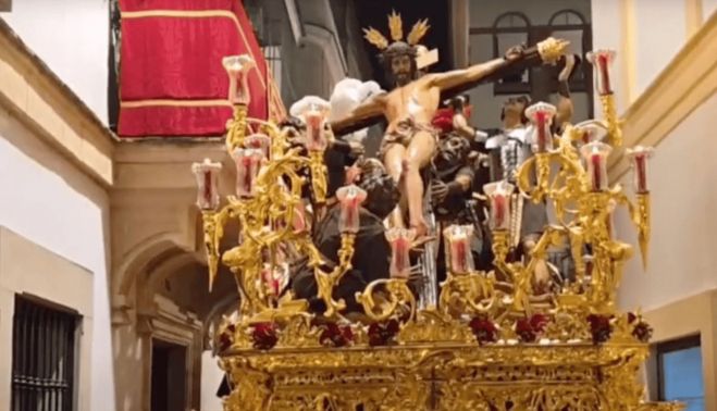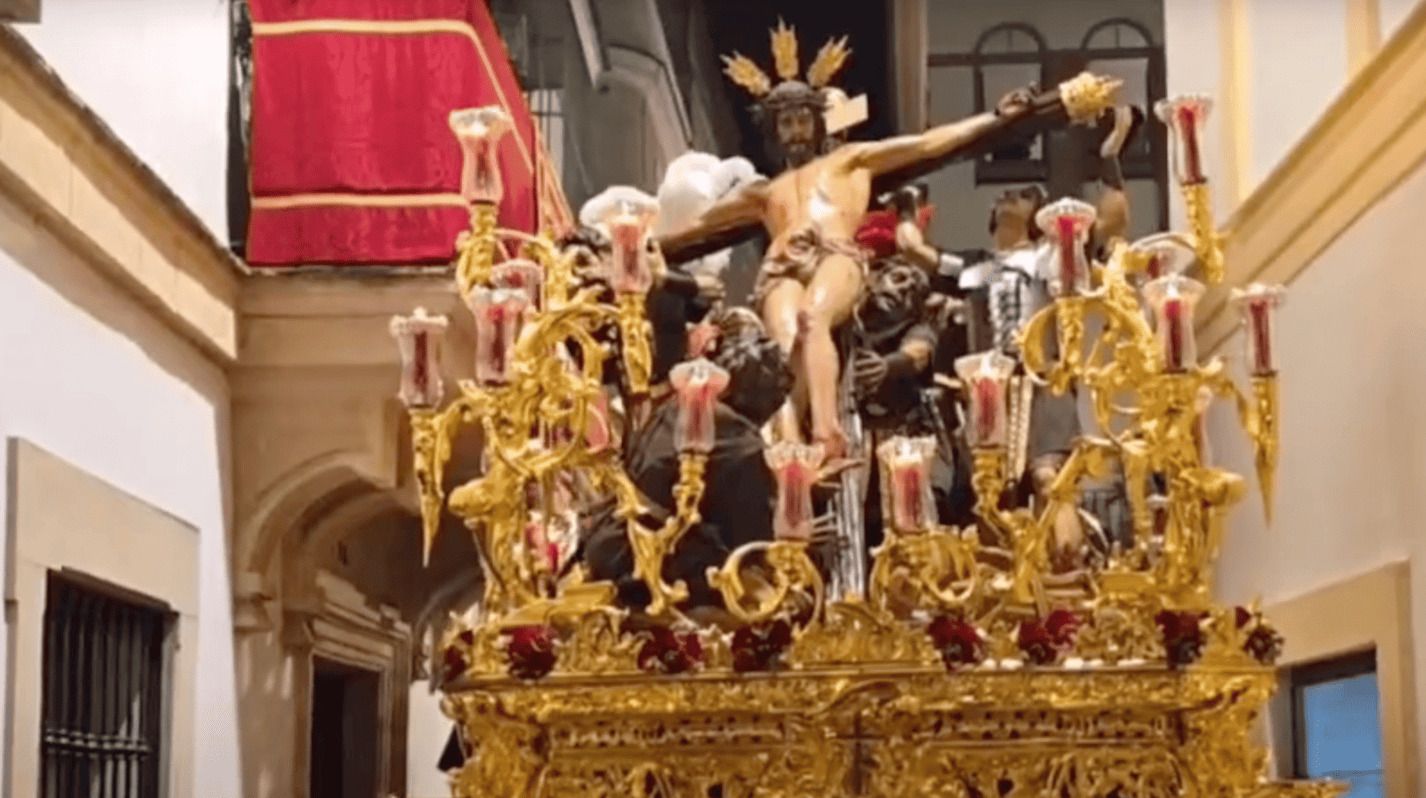 Un susto en la vuelta de las hermandades de Jerez este Viernes Santo a sus templos tras pasar por la Catedral. La tela de un balcón engalanado para la Semana Santa en calle Tornería ha ardido mientras pasaba el paso de misterio de la Exaltación.