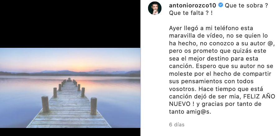 "Ayer llegó a mi teléfono esta maravilla de vídeo, no se quién lo ha hecho, no conozco a su autor, pero os prometo que quizás este sea el mejor para esta canción. Espero que su autor no se moleste por el hecho de compartir sus pensamientos con todos vosotros. Hace tiempo que está canción dejó de ser mía. Feliz año nuevo, y gracias por tanto de tanto amig@s", escribe Antonio Orozco en sus redes sociales, compartiendo un vídeo en el que se escucha su canción, Entre sobras y sobras me faltas, con un texto en el que se hace balance del año recién terminado.