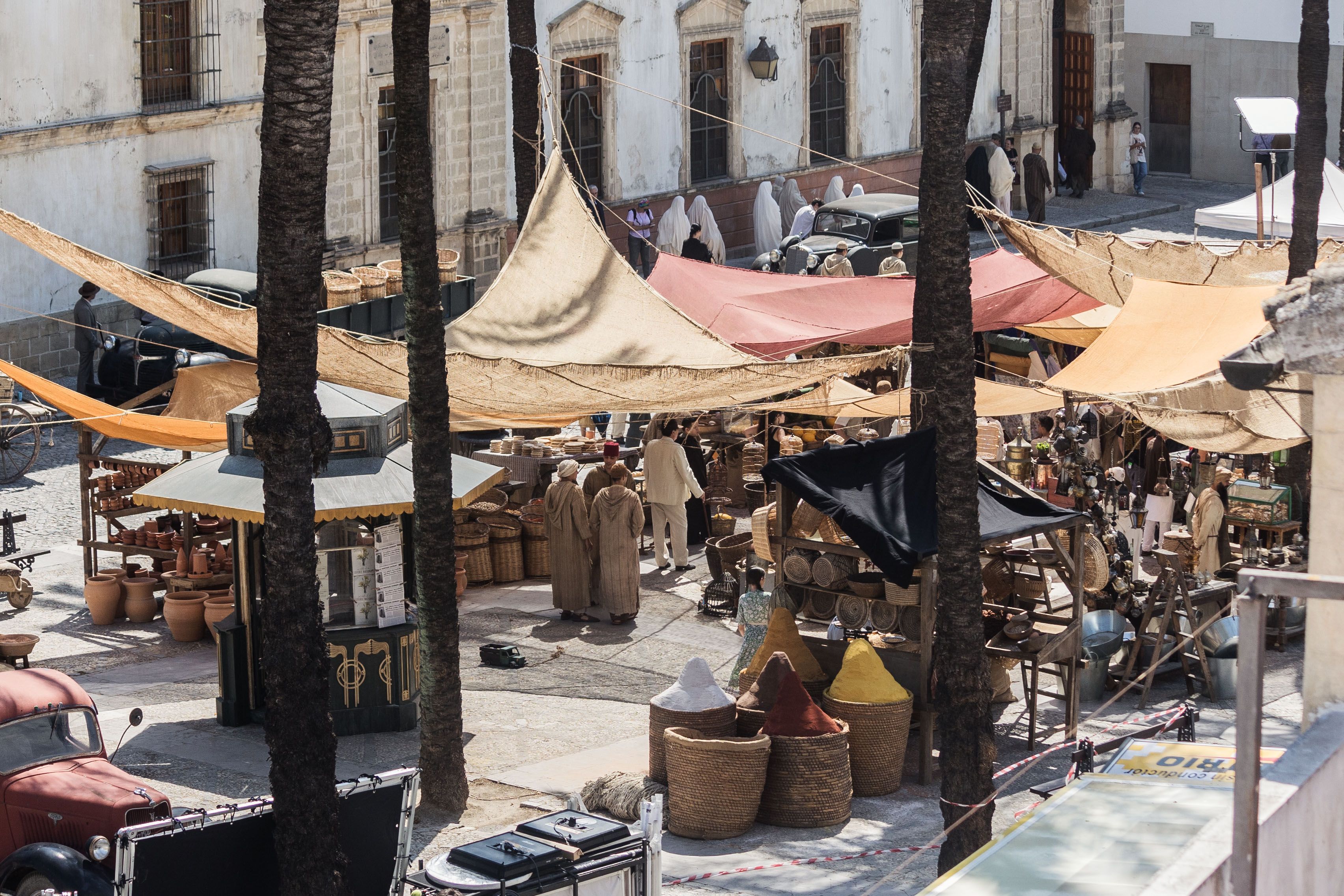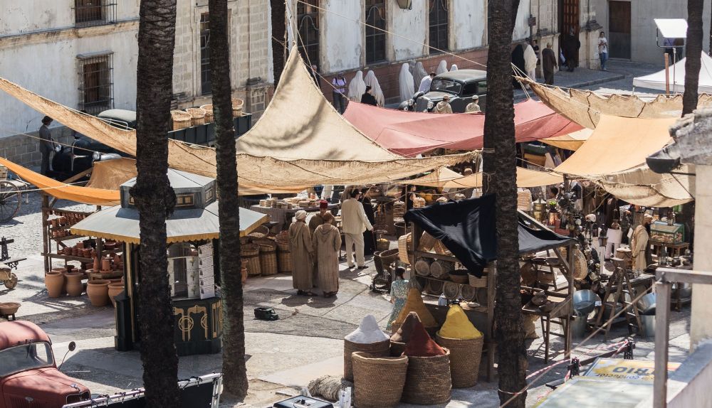 Pértigas de sonido, cámara, monitores, cableado, vehículos de producción, de maquillaje, de vestuario, jaimas, figurantes con rasgos árabes y también occidentales … y toda la parafernalia inherente al mundo del cine, así como todo el atrezzo necesario para ambientar este histórico enclave como un mercado árabe de Casablanca (Marruecos).