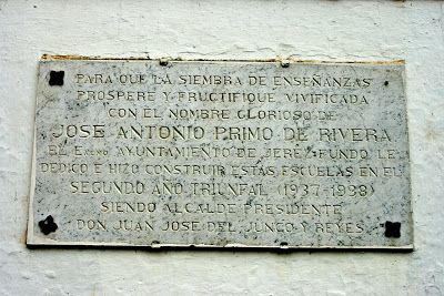 A través de nuestro buen amigo José Antonio Espinosa Maestre llegó hasta su hermano Francisco, reconocido historiador e investigador, una curiosa fotografía que habíamos realizado en La Barca de la Florida meses atrás. Se trata de la imagen de una veleta que aún corona la espadaña del antiguo edificio que perteneció a las Escuelas “José Antonio”, levantado en 1937 en plena Guerra Civil. En la veleta –que forma parte de nuestra serie sobre veletas en la campiña de Jerez– puede verse aún uno de los típicos símbolos del franquismo,-el yugo y las flechas, sobre el que se recorta la silueta de un soldado, rodilla en tierra, en posición de disparo.