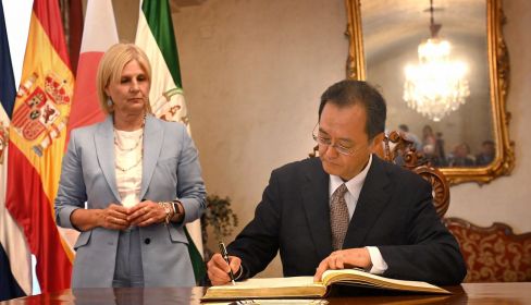 La alcaldesa ha dado la bienvenida al embajador, que ha firmado en el libro de honor del Ayuntamiento y le ha agradecido su visita “esperando que se sienta como en casa”. García-Pelayo ha evocado los lazos que unen a Jerez con Japón, mencionando el hermanamiento con la ciudad japonesa, Kiyosu, desde más de treinta años y la dedicación de la Feria de la Vendimia a Japón en 1974.