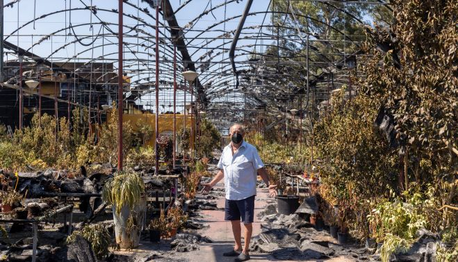 Entre las sombras negras, los restos y plásticos calcinados, todo el mostrador en los huesos, o un reloj que se quedó parado a las 17.35 horas —el desastre empezó a las tres de la tarde—, está el verde intenso de las plantas que han resistido. Es una escena entre dantesca y poética. Terrible para los dueños del negocio, y hasta para quienes alguna vez han pasado por caja con algunas macetas para llevar a casa, y poética por la capacidad de resistencia que siempre ofrece la naturaleza ante la catástrofe. De alguna manera, así está este jueves Manolo Olmedo, a sus 75 años: tiene los ojos rojos, con aire hundido, pero al mismo tiempo, seguro de que se levantarán de ésta.