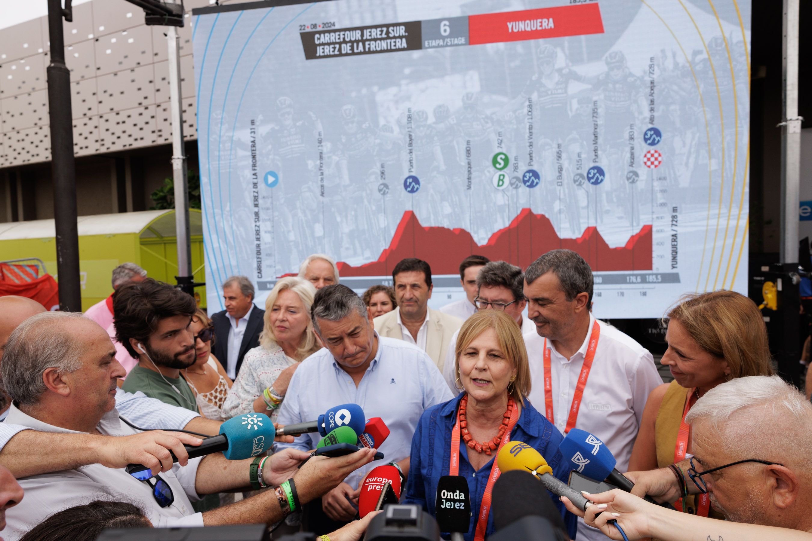 La Vuelta ciclista en Jerez ha movilizado a miles de personas. Y, consecuentemente, a una amplia representación institucional. La alcaldesa, María José García-Pelayo, ha ejercido de anfitriona acompañada por prácticamente todos los miembros de su equipo de gobierno. "Es una extraordinaria oportunidad, no solamente para promocionar el deporte, sino también para recuperar a Jerez como espacio de salida de La Vuelta diez años después".
