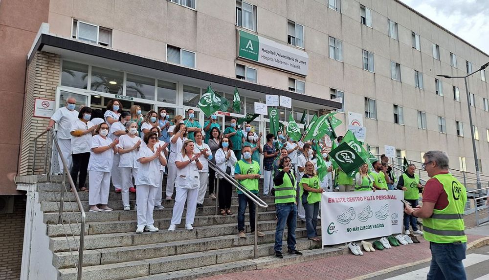 Falta personal en los centros sanitarios públicos y esto merma en el servicio que se ofrece a la ciudadanía. Una vez más, CSIF ha alzado la voz para reclamar al SAS que realice más contrataciones en la provincia gaditana. Medio centenar de sanitarios se ha concentrado en el Hospital Universitario de Jerez para sumarse a la campaña ‘No más zuecos vacíos’, impulsada por el sector de Sanidad de este sindicato.