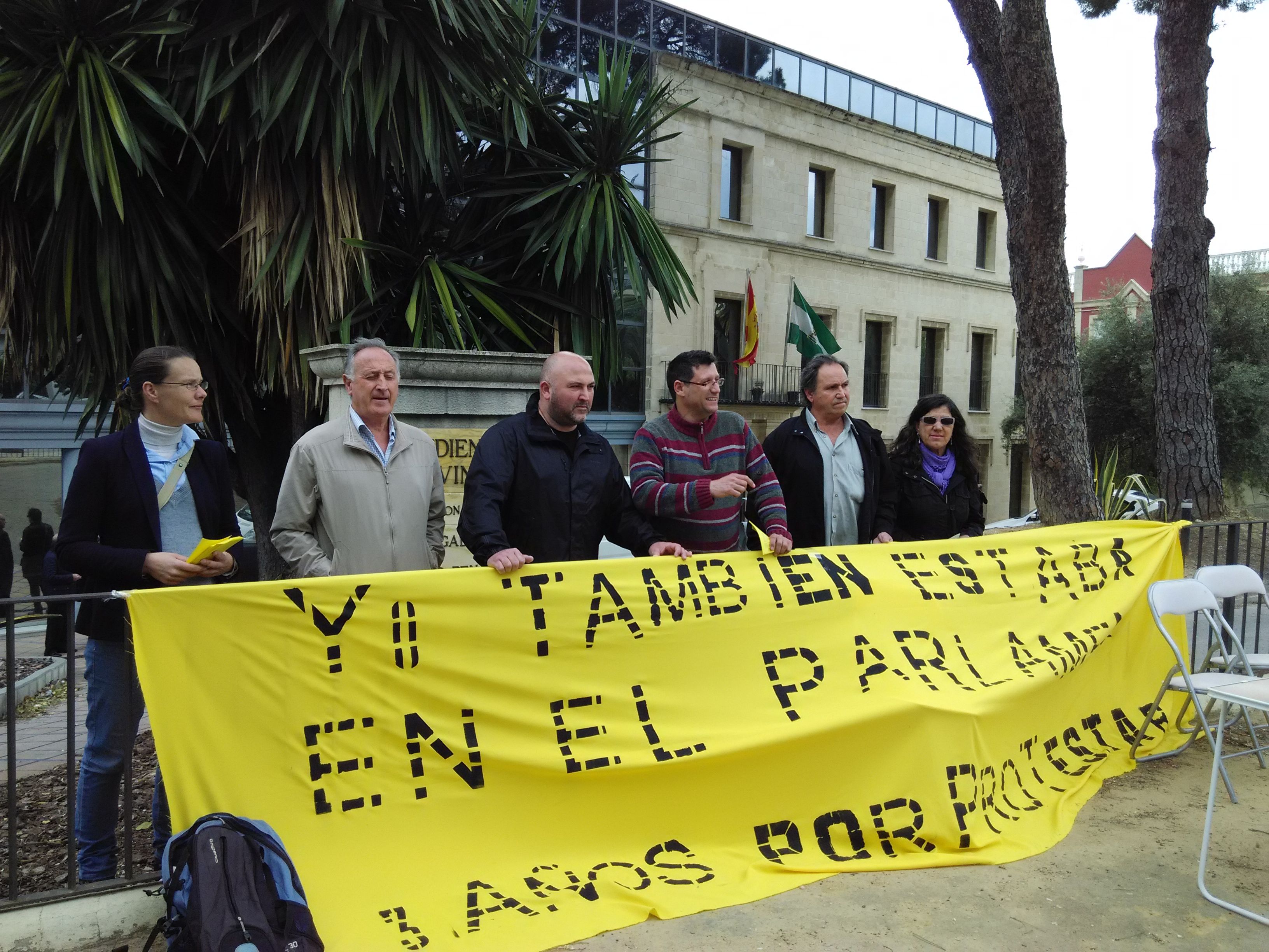 Los padres de Ciro Morales, el jerezano condenado a tres años por protestar ante el Parlamento de Cataluña en 2011, se concentran ante la Audiencia Provincial de Jerez. Hacen un llamamiento a la ciudadanía, a la que convocan a una manifestación que partirá el sábado al mediodía desde la plaza del Arenal.