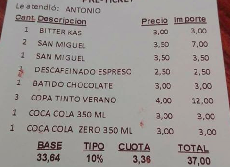 Un bitter kas (3 euros), tres cervezas (10,5), un café (2,5), un batido de chocolate (3), tres tintos de verano (12) y dos coca colas (6). Total, 37 euros. No es una broma, es el precio que un bar le cobró a sus clientes en Málaga el pasado 9 de abril. Uno de ellos, indignado por lo abusivo del precio, ha hecho sin duda lo que más duele, publicar una foto de la factura en su perfil de Facebook y pedir que se difunda. De momento, su mensaje ha calado y ya se ha compartido más de 5.300 veces.