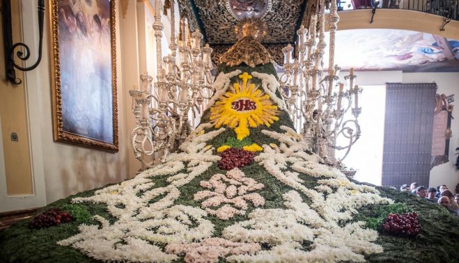 La Virgen de las Penas, titular de la hermandad homónima, porta nuevamente un manto confeccionado con flores naturales por el Servicio de Parques y Jardines del Ayuntamiento de Málaga. La tradición se mantiene desde 1944 y cada Martes Santo combina el trabajo de los jardineros municipales con el diseño propuesto por la cofradía.