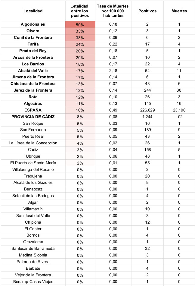 Tabla de letalidad en Cádiz entre municipios con positivos.