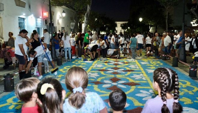 Sobre un fondo blanco se pintaron con sal tintada de colores rojo, amarillo, azul y verde las distintas filigranas y escudos que compusieron la alfombra diseñada por el artista Joaquín Lara. El delegado de Fiestas, Manuel Lobato, ha visitado esta mañana el trabajo de tintado, junto a la delegada de Infraestructuras, Rocío Sumariva.