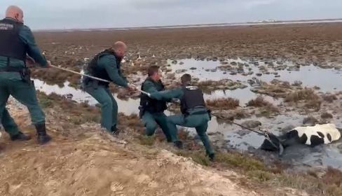 Una vaca enterrada en el fango en las marismas de Bonanza, en el río Guadalquivir, ha sido rescatada cuando presentaba claros síntomas de agotamiento e hipotermia. A punto de morir si no llega a ser por la labor de la Guardia Civil.