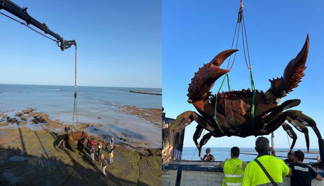 Chipiona despide a los cangrejos gigantes que durante más de un año han decorado las aguas bajo el faro más alto de España. Las esculturas, creadas por el artista Alfredo Zarazaga, han sido retiradas tras cumplir su objetivo: adquirir la textura marina que les dará su aspecto definitivo antes de transformarse en bronce.