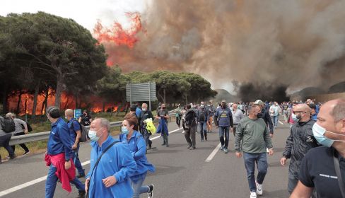 La protesta de los trabajadores de la planta de Airbus Puerto Real en la mañana de este miércoles ha tenido un punto negro que ha propiciado la paralización de la manifestación. Unos pinos del parque natural de la Bahía de Cádiz junto a los manifestantes han comenzado a arder y la preocupación es creciente en un día de viento en la provincia.