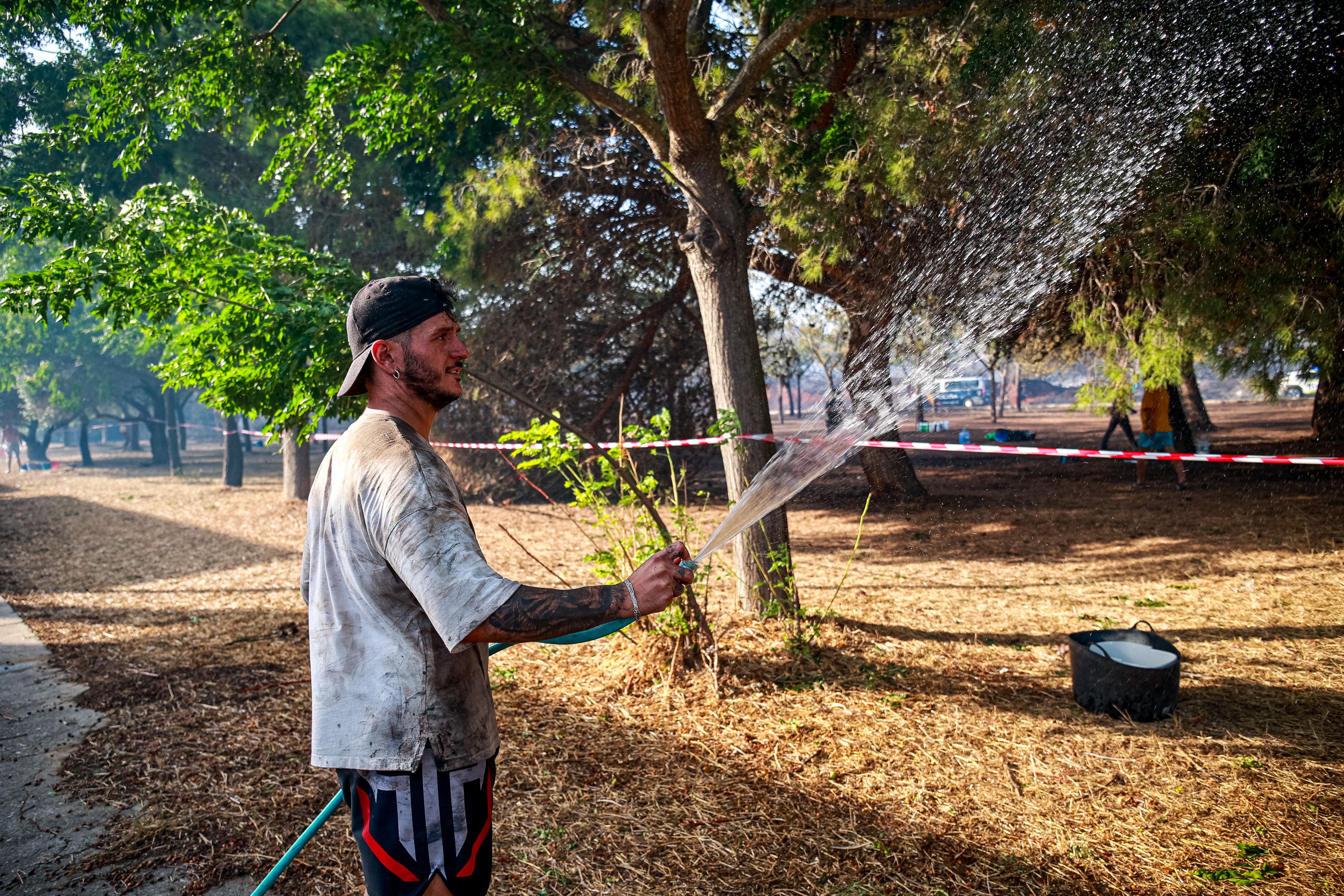 En colaboración con un bombero forestal del Plan Infoca, intenta coordinar los esfuerzos y la colaboración que prestan los trabajadores de centros de la provincia —especialmente, indica, de Puerto Real y de Jerez, donde han sido realojados los internos— para adecentar cuanto antes el patio donde se ubicaba una zona ajardinada y de actividades lúdicas. Los árboles con los que contaban ya no están, y algunos voluntarios aligeran en retirar los troncos y las ramas caídas, que van cortando con la mayor celeridad con una motosierra.