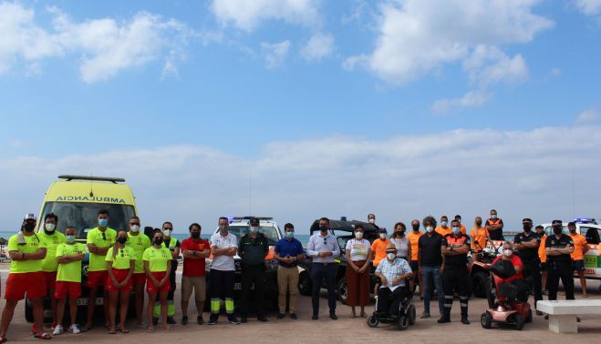 El alcalde de Barbate, Miguel Molina, junto al delegado de presidencia, Javier Rodríguez; el delegado de playas, José Jiménez Navas; la delegada de turismo, Sheyla Reyes; el delegado de accesibilidad, Juan José Ramos; y la concejala Pepi Rivera, acompañados por los miembros del Servicio de Socorrismo y Vigilancia, Policía Local y Guardia Civil, han inaugurado los servicios de playas del litoral barbateño, para la temporada 2021.