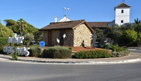 En la primera rotonda, la de la entrada de la gasolinera, se ha sustituido la fuente por una choza tradicional que cuenta con una cubierta a dos aguas, realizada al modo tradicional, con la paja de castañuela como material predominante. La choza se complementa con la silueta de un hombre y una mujer, trabajadores del campo que portan un cántaro de agua y material de labranza. Además, la choza está rodeada de zona verde y dispone de iluminación propia.