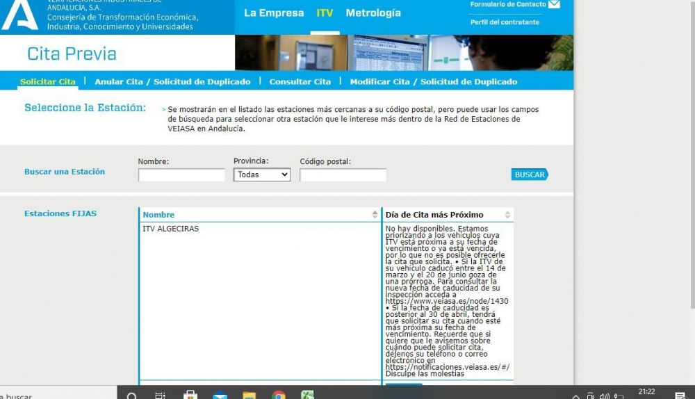 Pero, según denuncian desde la formación, el descontrol no queda solo ahí ya que si intentas ser previsor y pides la cita cinco meses antes del vencimiento, la web de Veaisa te devuelve el mensaje de que “están priorizando a los vehículos cuya ITV está próxima a su fecha de vencimiento o ya está vencida, por lo que no es posible ofrecerle la cita”. Para Podemos, según ha mantenido en una nota de prensa, "esto es inadmisible ya que la ley dicta que ser dueño de un vehículo matriculado, se use o no, obliga a que éste pase la ITV cada año, y es la Junta de Andalucía la que debe poner los medios, en tiempo y forma, y el remedio al colapso y descontrol que se sufre en la zona del Campo de Gibraltar".