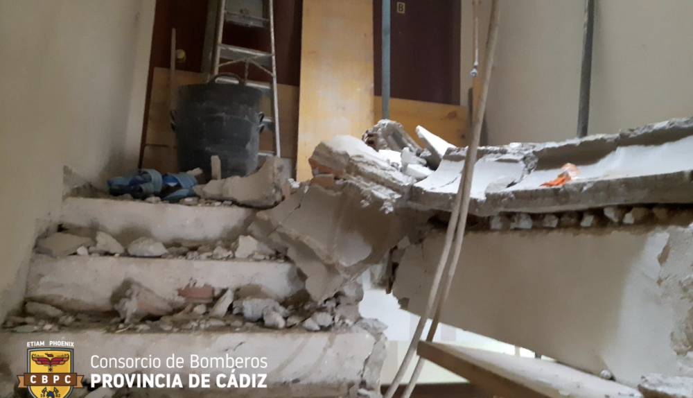 Posteriormente, el Consorcio Provincial de Bomberos de la Bahía de Cádiz ha informado que se ha procedido al rescate de una persona por un derrumbamiento del hueco escalera. Se trataba de un operario de la construcción que, con otro compañero, en un andamio a 3 metros de altura, estaba realizando la reforma para colocar un ascensor en el hueco.