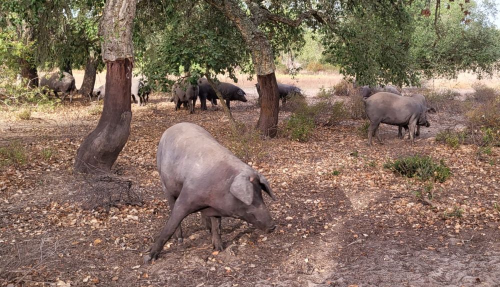 En la actualidad, también ha introducido cerdos ibéricos que aprovechan al máximo las bellotas que sueltan los Quercus. En total tiene 260 cerdos ibéricos que llegan a la finca con unos 40 kilos de peso y salen con 160 kilos y más de 12 meses, adquiridos directamente por una prestigiosa y conocida marca de jamón ibérico. Según detalla Coag, durante ese periodo, los cerdos, dirigidos por el capataz Antonio, deambulan por cientos de hectáreas entre alcornoques, pinos, chaparros, lentiscos, palmas y jaras.
