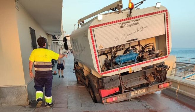Un vehículo del servicio municipal de limpieza de Chipiona ha sufrido un accidente este martes mientras realizaba labores en el paseo marítimo de la Cruz del Mar. El pavimento cedió bajo el peso del camión, lo que provocó que quedara parcialmente atrapado en el hundimiento del suelo.