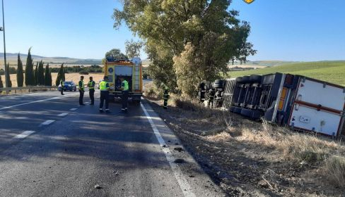 En esta ocasión, ha sido un camión con remolque el que ha volcado fuera de la calzada sobre el lado derecho.