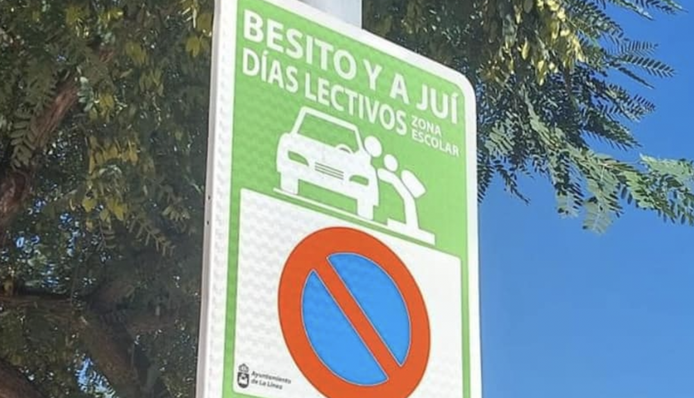 La Línea cuenta con una curiosa señal de tráfico que llama la atención. Sobre un fondo verde, se puede leer "Un besito y a juí". Es el nombre elegido por el Ayuntamiento de este municipio del Campo de Gibraltar para esta indicación que se advierte a la ciudadanía de lque se pueden hacer paradas de un minuto para dejar a los pequeños y pequeñas en los colegios cercanos.