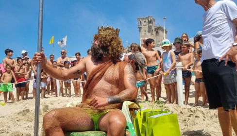 Un rey de los mares, entregado a su papel ha desembarcado y ha tomado posiciones en el mejor trono terrestre que podía tener: una playa Chica llena de pequeños entusiastas a la búsqueda de inmortalizar la jornada con la foto de ese sábado. Neptuno sigue reinando en la playa Chica. Ha llegado a bordo de la embarcación de la empresa New Angels.