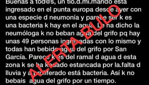 El alcalde de Algeciras, José Ignacio Landaluce, ha recurrido a su red social favorita, Facebook, para desmentir un bulo que estaba corriendo por las redes: "Si esta mañana te ha llegado un mensaje de Whatsapp sobre que hay 43 ingresados en el Hospital Punta Europa por beber agua del grifo en San García, debes saber que es absolutamente falso".