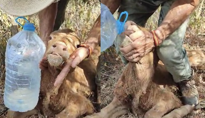 Vecinos y voluntarios de Pacma han socorrido este lunes a terneros y vacas que se encontraban abandonados en una finca de San Roque, en Cádiz. Según se observa en un vídeo publicado en sus redes sociales, un hombre le da agua a un ternero moribundo en este terreno en el que han divisado huesos y cadáveres.