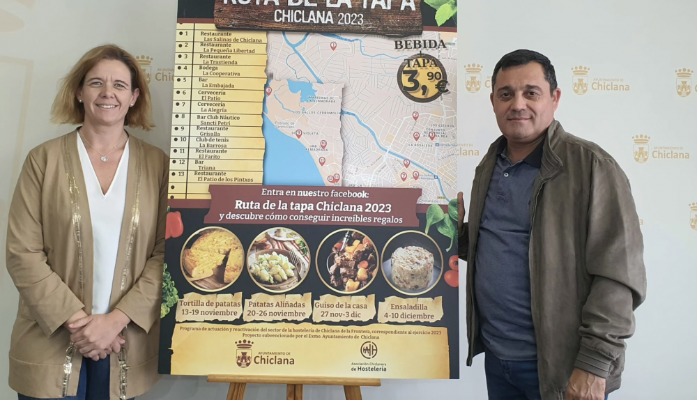 La delegada municipal de Fomento Económico, Manuela Pérez, y el presidente de la Asociación Chiclanera de Hostelería, Vittorio Canu, han presentado la Ruta de la Tapa Chiclana 2023, que se desarrollará del 13 de noviembre al 10 de diciembre. Una iniciativa incluida en el programa de actuación y reactivación de la hostelería de Chiclana y que cuenta con la subvención del Ayuntamiento de Chiclana.