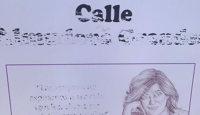 La placa o letrero que señala la calle dedicada a Almudena Grandes en Chiclana ha sido objeto de un acto vandálico que prácticamente la ha destrozado. Este hecho ha causado un profundo pesar en el entorno cultural de la ciudad y especialmente en el ámbito político.