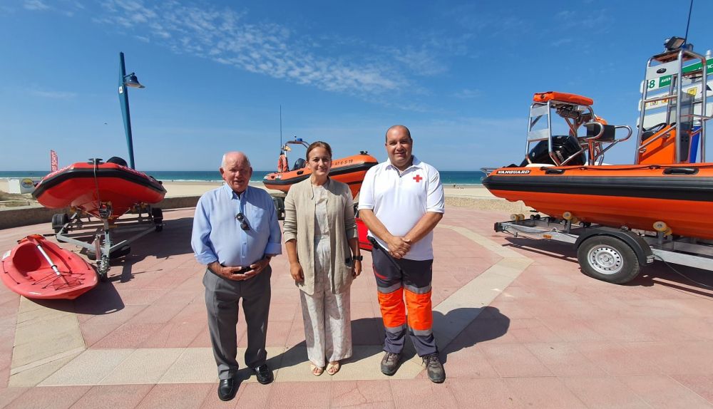 La delegada municipal de Playas en funciones, Ana González; el presidente de Cruz Roja Española en Chiclana, Antonio Piñero; y el coordinador del servicio de salvamento y socorrismo, José Antonio Rodríguez Santana, han presentado los nuevos medios acuáticos que se han adquirido para mejorar dicho servicio en las playas de Chiclana.