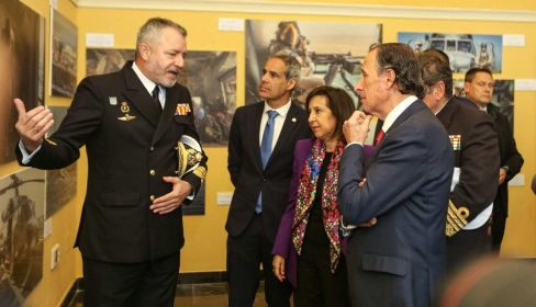 Tras el acto institucional, la ministra de Defensa ha firmado en el Libro de Oro del Ayuntamiento de Chiclana, ha recibido a modo de detalle la estatuilla de Melkart de manos del alcalde y ha inaugurado la exposición ‘Misión: Atalanta’, muestra organizada por la Secretaría General Técnica del Ministerio de Defensa, a través de la Subdirección General de Publicaciones y Patrimonio Cultural, y el Ayuntamiento de Chiclana, que alberga un total de 43 imágenes seleccionadas del libro del mismo título editado por dicha Subdirección en el año 2013. Una visita en la que la ministra y el alcalde han estado acompañados por el comandante del Cuartel General Marítimo de Alta Disponibilidad, José María Núñez Torrente, quien ha sido el encargado de explicar el contenido de la muestra.