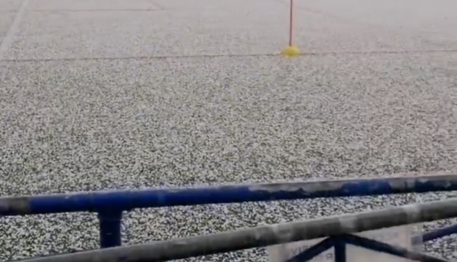 La cuenta MeteoCádiz ha compartido un vídeo del usuario @pablocampe_ donde se puede ver como unas instalaciones deportivas han quedado pintadas de blanco con la granizada en cuestión de segundos.