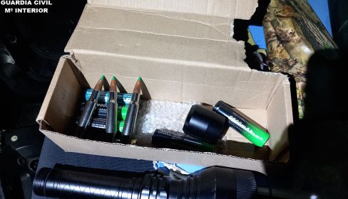 En otra intervención ocurrida el mismo día y en la misma localidad, se procedió a identificar a los ocupantes de otro vehículo que transportaban en el maletero un rifle de gran calibre provisto de mira telescópica, visor nocturno, un asiento de caza, un apoyo de tiro del rifle y, oculto bajo el asiento del copiloto, una linterna de gran alcance. Todo ello careciendo de documentación que justifique la tenencia y el uso del arma en el coto de caza menor al que se dirigía y careciendo igualmente de las autorizaciones medioambientales de caza pertinentes.