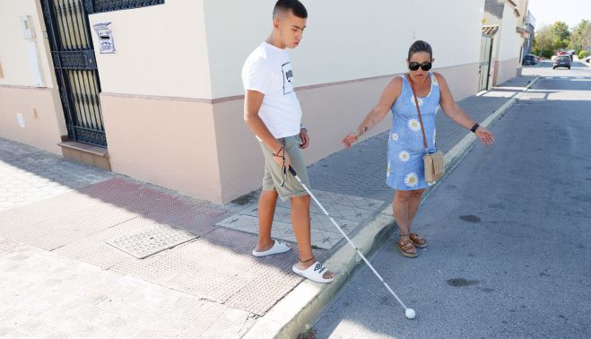 Un kilómetro y cuatrocientos metros. Esa es la distancia entre la casa de Francisco Manuel, un chico con discapacidad visual de 16 años, y su instituto en la plaza de Jesús, en el centro de Puerto Real. Según Google Maps, el recorrido a pie se puede hacer exactamente en 19 minutos. Nosotros, Francisco Manuel, su madre Mari Paz, el fotógrafo y esta redactora, tardamos cerca de 40 minutos. El paso es más lento y, especialmente, inseguro, lleno de trampas mortales en forma pasos de peatones con guías táctiles desgastadas y muchos sin rebajes y sin un solo semáforo en todo el camino que, de manera sonora, permita a Francisco Manuel ir sólo a su instituto como cualquier otro chaval de Puerto Real.