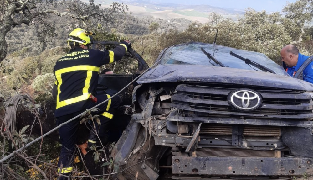 Aparatoso accidente de tráfico en el kilómetro 15 de la CA-5201, en finca La Atalaya, cerca de la aldea de Los Navaeros en la provincia de Cádiz. Un hombre circulaba por la vía en un todoterreno cuando se ha salido de la pista forestal debido al estado de suelo por la lluvia. En ese momento, se ha precipitado por un barranco en medio del monte.