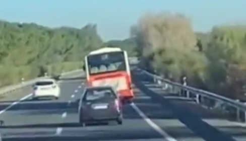 Uno de los conductores ha grabado la escena, que ha compartido la plataforma Social Drive en redes sociales. En el vídeo se puede observar cómo el autobús continúa su marcha a pesar de estar tambaleándose, con el peligro que conlleva.