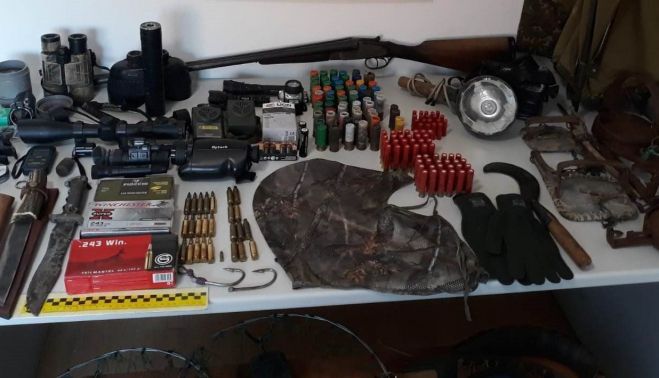 Los guardias civiles de Alcalá procedieron a registrar en el momento de su detención la explotación ganadera, encontrando ocultos en la misma una escopeta con el número de serie borrado, cientos de cartuchos de distintos calibres, algunos de ellos prohibidos, intensificadores de luz, miras telescópicas provistas de visión por infrarrojos, básculas portátiles para pesar las piezas e incluso la capucha con la que ocultaba su rostro durante sus correrías furtivas.